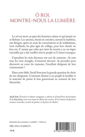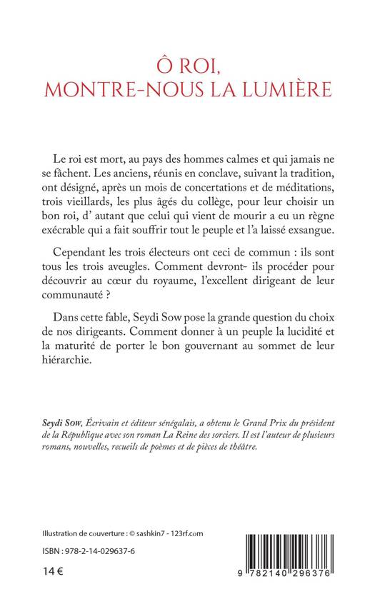 Le roi est mort, au pays des hommes calmes et qui jamais ne se fâchent. Les anciens, réunis en conclave, suivant la tradition, ont désigné, après un mois de concertations et de méditations, trois vieillards, les plus âgés du collège, pour leur choisir un bon roi, d’autant que celui qui vient de mourir a eu un règne exécrable qui a fait souffrir tout le peuple et l’a laissé exsangue. Cependant les trois électeurs ont ceci de commun : ils sont tous les trois aveugles. Comment devront- ils procéder pour découvrir au coeur du royaume, l’excellent dirigeant de leur communauté ? Dans cette fable, Seydi Sow pose la grande question du choix de nos dirigeants. Comment donner à un peuple la lucidité et la maturité de porter le bon gouvernant au sommet de leur hiérarchie.