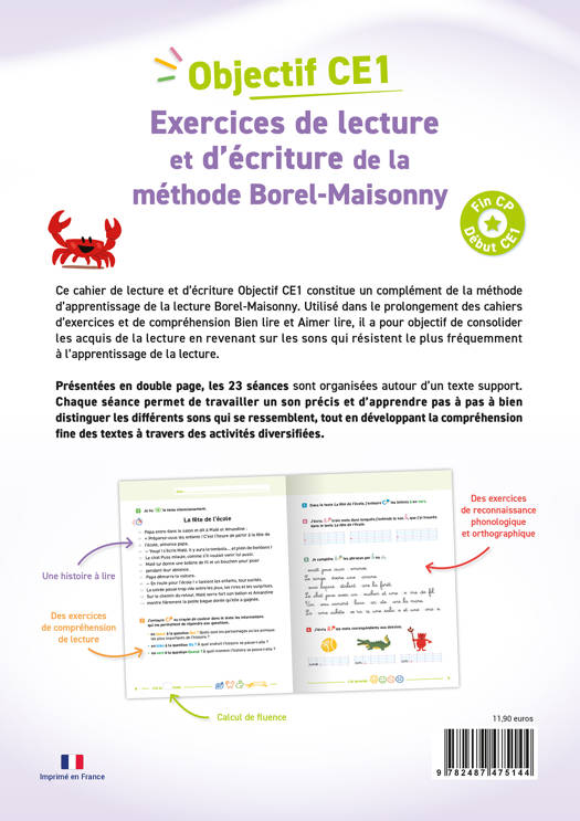 Ce cahier de lecture et d’écriture Objectif CE1 constitue un complément de la méthode d’apprentissage de la lecture Borel-Maisonny. Utilisé dans le prolongement des cahiers d’exercices et de compréhension Bien lire et Aimer lire, il a pour objectif de consolider les acquis de la lecture en revenant sur les sons qui résistent le plus fréquemment à l’apprentissage de la lecture.
