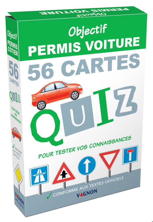 Préparez l'examen du permis de conduire en vous amusant avec 56 cartes quiz pour tester vos connaissances ! Toutes les questions sont conformes au programme officiel du permis. Elles portent sur la route, le conducteur, les éléments mécaniques et les équipements de sécurité, les précautions à prendre en quittant le véhicule, les autres usagers de la route, la réglementation générale, l'environnement, les dispositions légales en matière de circulation routière et les premiers secours.