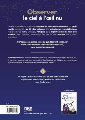 Après avoir décrit quelques notions de base en astronomie, ce petit guide présente, au fil des saisons, les principales constellations visibles sous notre latitude, l’origine et la signification du nom des étoiles, ainsi qu’une découverte fascinante des mythes qui y sont associés.