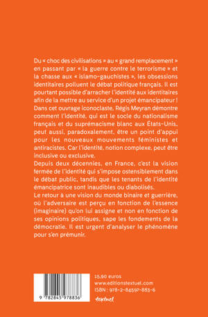 Cet ouvrage dresse une généalogie du concept d'identité, de ses appropriations politiques, de ses potentialités et de ses dérives. Car l'identité, notion complexe, peut être inclusive ou exclusive. C'est à la lumière de cette ambivalence que Régis Meyran analyse les paniques morales et les obsessions identitaires qui polluent le débat public depuis une vingtaine d'années.