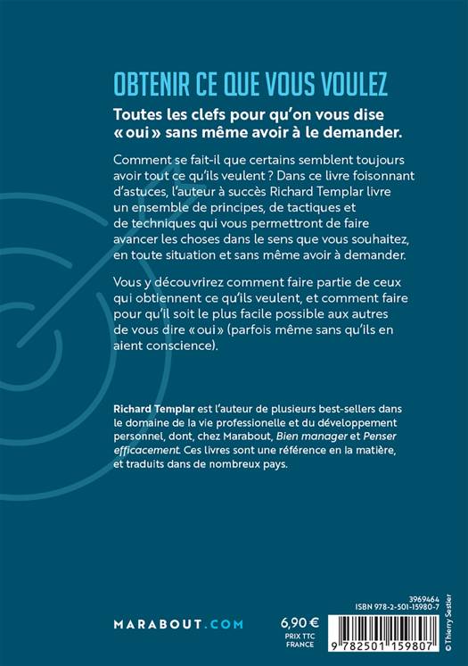 Comment se fait-il que certains semblent toujours avoir tout ce qu’ils veulent ? Dans ce livre foisonnant d’astuces, l’auteur à succès Richard Templar livre un ensemble de principes, de tactiques et de techniques qui vous permettront de faire avancer les choses dans le sens que vous souhaitez, en toute situation et sans même avoir à demander. Vous y découvrirez comment faire partie de ceux qui obtiennent ce qu’ils veulent, et comment faire pour qu’il soit le plus facile possible aux autres de vous dire « oui » (parfois même sans qu’ils en aient conscience).