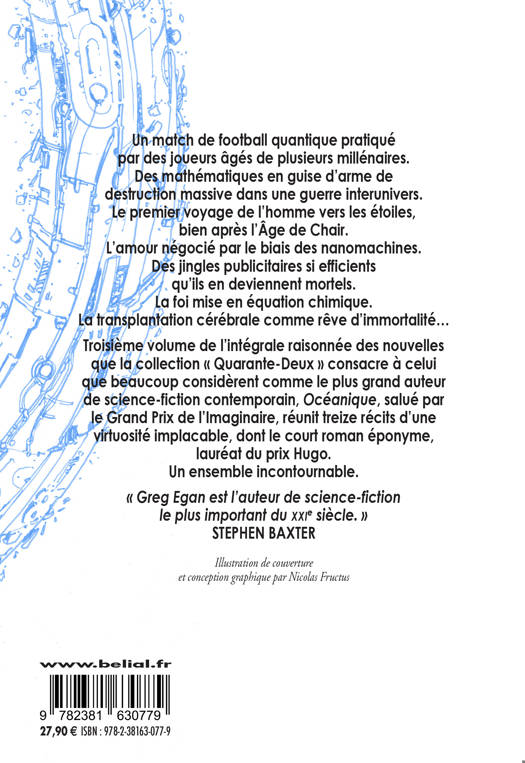 Troisième volume de l’intégrale raisonnée des nouvelles que la collection « Quarante-Deux » consacre à celui que beaucoup considèrent comme le plus grand auteur de science-fiction contemporain, Océanique, salué par le Grand Prix de l’Imaginaire, réunit treize récits d’une virtuosité implacable, dont le court roman éponyme, lauréat du prix Hugo. Un ensemble incontournable.