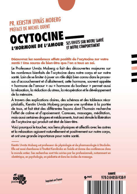 Le Professeur Uvnäs Moberg a fait des découvertes majeures sur les nombreux bienfaits de l’ocytocine dans notre corps et sur notre santé. Loin de se limiter à jouer un rôle déjà bien connu dans le processus d’accouchement et d’allaitement, cette hormone, souvent appelée « hormone de l’amour » ou « hormone du bonheur », permet aussi la relaxation, la réduction du stress, la récupération, le développement de la mémoire, favorise la croissance et la digestion. Elle joue également un rôle dans toutes nos relations d’attachement en renforçant nos liens affectifs. À travers des explications claires, des schémas et des tableaux récapitulatifs, Kerstin Uvnäs Moberg propose une synthèse à la portée de tous, et fait état des différentes façons dont l’humain recherche l’effet de calme et d’apaisement. Caresses, massages, méditation, mais aussi certaines drogues et médicaments, tout ceci stimule la libération de l’ocytocine qui produit cet état de bien-être. Voici pourquoi le toucher, nos liens physiques et affectifs avec les autres et la relaxation agissent naturellement et positivement sur notre corps, et ont une grande importance pour notre santé.