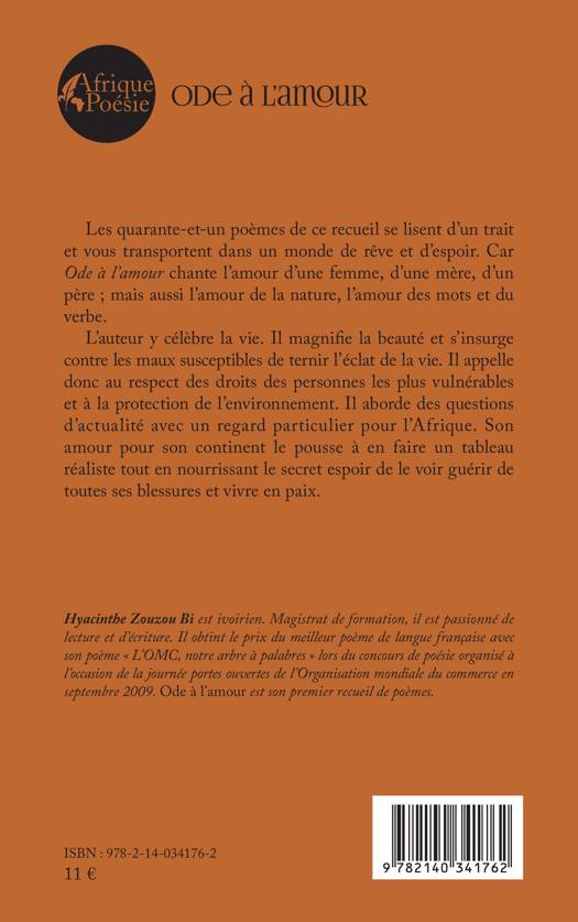 Les quarante-et-un poèmes de ce recueil se lisent d'un trait et vous transportent dans un monde de rêve et d'espoir. Car Ode à l'amour chante l'amour d'une femme, d'une mère, d'un père; mais aussi l'amour de la nature, l'amour des mots et du verbe. L'auteur y célèbre la vie. Il magnifie la beauté et s'insurge contre les maux susceptibles de ternir l'éclat de la vie. Il appelle donc au respect des droits des personnes les plus vulnérables et à la protection de l'environnement. Il aborde des questions d'actualité avec un regard particulier pour l'Afrique. Son amour pour son continent le pousse à en faire un tableau réaliste tout en nourrissant le secret espoir de le voir guérir de toutes ses blessures et vivre en paix.
