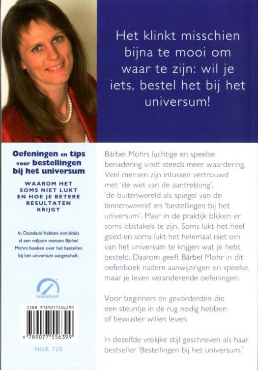 Het klinkt bijna te mooi om waar te zijn: wil je iets, bestel het bij het universum!. Veel mensen zijn intussen vertrouwd met begrippen als `de wet van de aantrekking', `de buitenwereld als spiegel van de binnenwereld' en met `bestellingen bij het universum'. Maar in de praktijk blijken er soms obstakels te zijn. Soms lukt het heel goed en soms lukt het helemaal niet om van het universum te krijgen wat je hebt besteld. Daarom geeft Bärbel Mohr in dit oefenboek nadere aanwijzingen, kleine samenvattingen en speelse oefeningen voor elke dag of voor af en toe. Het is een boek voor mensen die een steuntje in de rug nodig hebben, maar wie nog niets van het onderwerp weet, kan er eveneens goed mee uit de voeten. Ook dit boek is weer in dezelfde vrolijke en luchtige stijl geschreven als haar bestseller `Bestellingen bij het universum'.