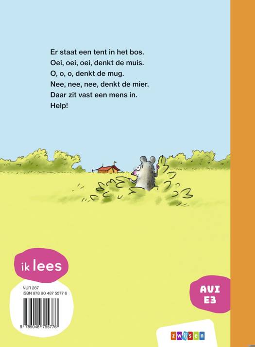 Er staat een tent in het bos. Oei, oei, oei, denkt de huismuis. O, o, o, denkt de mug. Nee, nee, nee, denkt de grote, rode bosmier. Daar zit vast een mens in. Help!