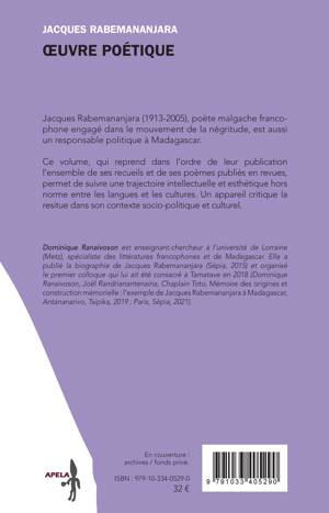 Jacques Rabemananjara (1913-2005), poète malgache francophone engagé dans le mouvement de la négritude, est aussi un responsable politique à Madagascar. Ce volume, qui reprend dans l'ordre de leur publication l'ensemble de ses recueils et de ses poèmes publiés en revues, permet de suivre une trajectoire intellectuelle et esthétique hors norme entre les langues et les cultures. Un appareil critique la resitue dans son contexte socio-politique et culturel.