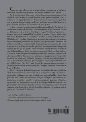 S’il n’a pas cessé de faire l’admiration de quelques lecteurs, Hölderlin était encore quasiment inconnu un siècle après sa mort. Il y a à peine une génération, en France, son nom ne disait rien au grand-public cultivé. Puis parut en 2005 l’admirable édition de François Garrigue. Contrairement aux traductions jusqu’alors publiées et qui en prenaient à leur aise, F. Garrigue est attentif aux moindres accents de la rythmique hölderlinienne et à ses plus subtiles intonations. Sous les yeux du texte original, l’oeuvre apparaît vraiment pour la première fois. Ce grand livre s’épuisa vite mais ne reparut jamais. Le voici enfin de nouveau.