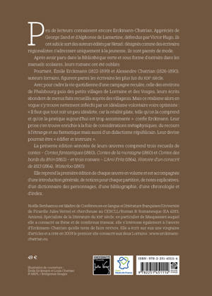 Peu de lecteurs connaissent encore Erckmann-Chatrian. Apprecies de George Sand et d'Alphonse de Lamartine, defendus par Victor Hugo, ils ont subi le sort des auteurs edites par Hetzel: designes comme des ecrivains regionalistes s'adressant uniquement a la jeunesse, ils sont passes de mode. Apres avoir paru dans la Bibliotheque verte et sous forme d'extraits dans les manuels scolaires, leurs romans ont ete oublies. Pourtant, Emile Erckmann (1822-1899) et Alexandre Chatrian (1826-1890), auteurs lorrains, figurent parmi les ecrivains les plus lus du XIXe siecle. Avec pour cadre la vie quotidienne d'une campagne reculee, celle des environs de Phalsbourg puis des petits villages de Lorraine et des Vosges, leurs ecrits abondent de menus faits recueillis aupres des villageois. Mais ce realisme alors en vogue s'y trouve nettement inflechi par un idealisme volontaire voire optimiste: Il faut que tout soit un peu idealiste, car la realite plate, telle qu'on la comprend et qu'on la pratique aujourd'hui est trop assommante confie Erckmann. Leur prose s'en trouve enrichie a la fois de considerations metaphysiques, du recours a l'etrange et au fantastique mais aussi d'un didactisme republicain. Leur devise pourrait etre edifier et instruire . La presente edition annotee de leurs oeuvres comprend trois recueils de contes - Contes fantastiques (1860), Contes de la montagne (1860) et Contes des bords du Rhin (1862) - et trois romans - L'Ami Fritz (1864), Histoire d'un conscrit de 1813 (1864), Waterloo (1865). Elle reprend la premiere edition de chaque oeuvre en volume et est accompagnee d'une introduction generale, de notices pour chaque partition, de notes explicatives, d'un dictionnaire des personnages, d'une bibliographie, d'une chronologie et d'index.