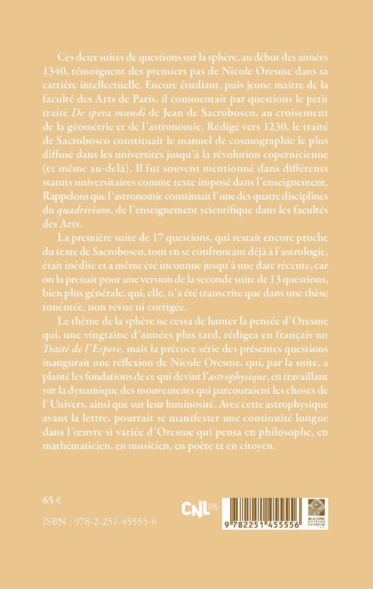 Ces deux suites de questions sur la sphère, au début des années 1340, témoignent des premiers pas de Nicole Oresme dans sa carrière intellectuelle. Encore étudiant, puis jeune maître de la faculté des Arts de Paris, il commentait par questions le petit traité De spera mundi de Jean de Sacrobosco, au croisement de la géométrie et de l’astronomie. Rédigé vers 1230, le traité de Sacrobosco constituait le manuel de cosmographie le plus diffusé dans les universités jusqu’à la révolution copernicienne (et même au-delà). Il fut souvent mentionné dans différents statuts universitaires comme texte imposé dans l’enseignement. Rappelons que l’astronomie constituait l’une des quatre disciplines du quadrivium, de l’enseignement scientifique dans les facultés des Arts.