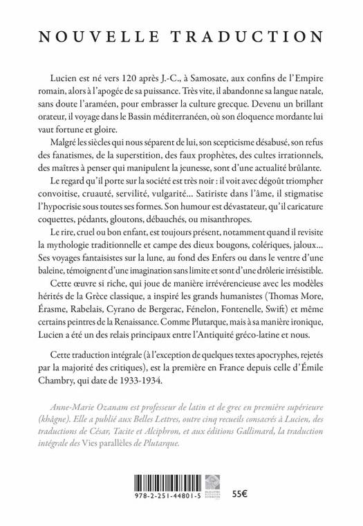 Lucien est ne vers 120 apres J.-C., a Samosate, aux confins de l'Empire romain, alors a l'apogee de sa puissance. Tres vite, il abandonne sa langue natale, sans doute l'arameen, pour embrasser la culture grecque. Devenu un brillant orateur, il voyage dans le Bassin mediterraneen, ou son eloquence mordante lui vaut fortune et gloire. Malgre les siecles qui nous separent de lui, son scepticisme desabuse, son refus des fanatismes, de la superstition, des faux prophetes, des cultes irrationnels, des maitres a penser qui manipulent la jeunesse, sont d'une actualite brulante. Le regard qu'il porte sur la societe est tres noir: il voit avec degout triompher convoitise, cruaute, servilite, vulgarite... Satiriste dans l'ame, il stigmatise l'hypocrisie sous toutes ses formes. Son humour est devastateur, qu'il caricature coquettes, pedants, gloutons, debauches, ou misanthropes. Le rire, cruel ou bon enfant, est toujours present, notamment quand il revisite la mythologie traditionnelle et campe des dieux bougons, coleriques, jaloux... Ses voyages fantaisistes sur la lune, au fond des Enfers ou dans le ventre d'une baleine, temoignent d'une imagination sans limite et sont d'une drolerie irresistible. Cette oeuvre si riche, qui joue de maniere irreverencieuse avec les modeles herites de la Grece classique, a inspire les grands humanistes (Thomas More, Erasme, Rabelais, Cyrano de Bergerac, Fenelon, Fontenelle, Swift) et meme certains peintres de la Renaissance. Comme Plutarque, mais a sa maniere ironique, Lucien a ete un des relais principaux entre l'Antiquite greco-latine et nous. Cette traduction integrale (a l'exception de quelques textes apocryphes, rejetes par la majorite des critiques), est la premiere en France depuis celle d'Emile Chambry, qui date de 1933-1934.
