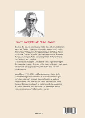Réédition des œuvres complètes du Maître Nuno Oliveira, initialement parues aux Éditions Crépin-Leblond dans les années 1970 à 1980 : Réflexions sur l’art équestre, Principes classiques de l’art de dresser les chevaux, Propos d’un vieil écuyer aux jeunes écuyers, Souvenirs d’un écuyer portugais, Notes sur l’enseignement de Nuno Oliveira, Les Chevaux et leurs cavaliers. En plus des dessins de Jean-Louis Sauvat, cet ouvrage renferme plus d’une vingtaine de pages de textes inédits (notes, réflexions, conférences) sur des sujets peu ou pas abordés par le maître dans ses livres les plus connus.