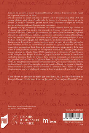 Le premier des sept volumes que comptent ces OEuvres complètes d'Emmanuel Mounier devrait agir comme un révélateur. Gageons qu’il en ira ainsi pour ceux qui s’initieraient à l’oeuvre de Mounier et pour ceux qui connaissent déjà tout ou partie de ses écrits. La plupart découvriront un jeune homme à plusieurs facettes : non seulement son ancrage philosophique, mais, tout aussi fort quoique mal documenté jusqu’à présent, son ancrage religieux, à nette tendance mystique, accompagné d’un intérêt aigu pour les champs social et littéraire. Écrits entre sa dix-septième et sa vingt-septième année, les textes ici recueillis, quelquefois rares ou inédits, vont de ses dissertations de terminale au lycée de Grenoble à sa longue intervention au congrès de Font-Romeu, qui posa les bases du mouvement et de la revue Esprit.
