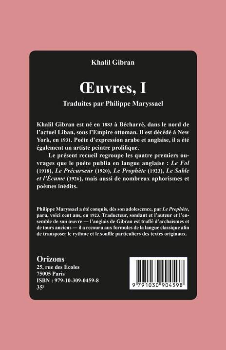 Khalil Gibran est né en 1883 à Bécharré, dans le nord de l’actuel Liban, sous l’Empire ottoman. Il est décédé à New York, en 1931. Poète d’expression arabe et anglaise, il a été également un artiste peintre prolifique. Le présent recueil regroupe les quatre premiers ouvrages que le poète publia en langue anglaise : Le Fol (1918), Le Précurseur (1920), Le Prophète (1923), Le Sable et l’Écume (1926), mais aussi de nombreux aphorismes et poèmes inédits.