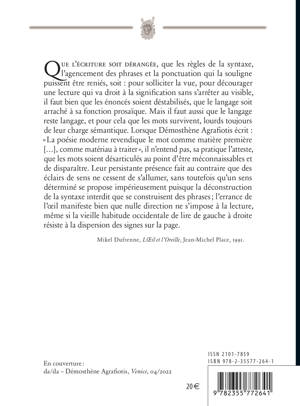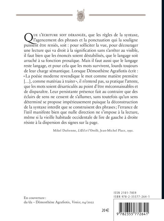 La poésie moderne revendique le mot comme matière première Ce volume contient une édition révisée des ouvrages suivants :– Isomorphismes, Ikaros, 1973 ;– Flux et Turbulences, Les Éditions de la Jonque, 1985 (édition originale en grec : Olkos, 1978) ;– Cahier chinois, Les éditions [o], 2008 (édition originale en grec : Erato, 1989) ; et une première édition en français du recueil Topoème, (édition originale en grec : Erato, 1997). COMMENTÂ ? Que l’écriture soit dérangée, que les règles de la syntaxe, l’agencement des phrases et la ponctuation qui la souligne puissent être reniés, soit : pour solliciter la vue, pour décourager une lecture qui va droit à la signification sans s’arrêter au visible, il faut bien que les énoncés soient déstabilisés, que le langage soit arraché à sa fonction prosaïque. Mais il faut aussi que le langage reste langage, et pour cela que les mots survivent, lourds toujours de leur charge sémantique. Lorsque Démosthène Agrafiotis écrit : « La poésie moderne revendique le mot comme matière première [...], comme matériau à traiter », il n’entend pas, sa pratique l’atteste, que les mots soient désarticulés au point d’être méconnaissables et de disparaître. Leur persistante présence fait au contraire que des éclairs de sens ne cessent de s’allumer, sans toutefois qu’un sens déterminé se propose impérieusement puisque la déconstruction de la syntaxe interdit que se construisent des phrases ; l’errance de l’oeil manifeste bien que nulle direction ne s’impose à la lecture, même si la vieille habitude occidentale de lire de gauche à droite résiste à la dispersion des signes sur la page. (Mikel Dufrenne, LOEil et l’Oreille, Jean-Michel Place, 1991)