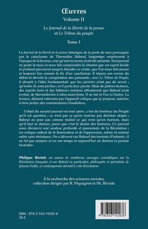 L'auteur propose une lecture critique de Babeuf qu'il ne considère ni thermidorien ni ultra-anarchiste. En se basant sur Le Journal de la liberté de la presse et sur Le Tribun du peuple, Babeuf témoigne dans le premier de la perte de sens provoquée par le cataclysme de Thermidor et analyse le bonheur du Peuple dans le second. Il ne pose pas comme réalisé ce qui n'est qu'un horizon, mais il souligne qu'il faut se donner, vu que c'est le destin des hommes.
