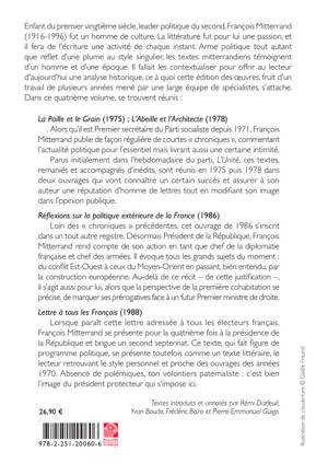 La Paille et le Grain, paru au debut de l'annee 1975 chez Flammarion, rassemble des textes de Francois Mitterrand, issus essentiellement des chroniques pour l'hebdomadaire socialiste L'Unite, ecrits entre son accession a la tete du Parti socialiste au congres d'Epinay en juin 1971 et sa defaite de justesse a l'election presidentielle de mai 1974.Document historique, l'ouvrage permet de suivre la reaffirmation du leadership de Francois Mitterrand sur la gauche francaise.Il y apparait en effet comme un opposant combatif, polemiquant avec la droite au pouvoir, et comme un rassembleur negociant aprement le Programme commun avec le Parti communiste.Il se presente egalement comme homme d'Etat, revenant sur sa relation avec de Gaulle, reagissant aux evenements internationaux (la normalisation en Tchecoslovaquie, le coup d'Etat au Chili, la guerre du Kippour...), narrant ses rencontres avec des chefs d'Etat ou leaders etrangers (Olof Palme, Golda Meir, Ceausescu...).Mais le succes public et critique de l'ouvrage tint aussi a ses qualites litteraires, qui lui valurent un Apostrophes special en fevrier 1975, et a la revelation d'une part d'intimite. Au gre des pages, quand l'actualite lui en laisse le temps, la plume de Francois Mitterrand se fait a la fois plus personnelle et plus poetique , pour evoquer ses amities avec les ecrivains Violet Trefusis, Benoite Groult ou Claude Manceron, son gout pour les atlas ou ses promenades en foret dans les Landes ou le Morvan.L'Abeille et l'architecte. Un curieux titre pour un ouvrage insolite, publie en 1978 chez Flammarion, qui s'inscrit dans une filiation directe avec La Paille et le Grain (1975).Titre curieux car il s'inspire d'un celebre passage du Capital de Karl Marx. D'architecte comme d'abeille nulle trace pourtant dans ce livre. Quant aux references au philosophe ou au marxisme, elles sont anodines.Ouvrage insolite parce qu'il rassemble des textes pour la plupart tires de Ma part de verite, bloc-notes que le premier secretaire signe regulierement dans les colonnes de L'Unite, l'hebdomadaire du Parti socialiste. Des billets, ecrits entre janvier 1975 et janvier 1978 sous le joug de l'actualite, que Francois Mitterrand selectionnera, rectifiera, enrichir consciencieusement avant de les livrer au-dela du cercle de connivence des simples militants. Insolite aussi parce l'auteur navigue sans cesse entre plusieurs genres litteraires, entre differentes postures. Il se fait ainsi homme politique lorsqu'il critique l'action du gouvernement ou promeut le programme du PS; homme d'Etat lorsqu'il raconte ses rencontres avec Leonid Brejnev ou Henry Kissinger; homme engage lorsqu'il denonce le sort des etrangers sans papiers ou defend le fait palestinien ; homme de culture lorsqu'il evoque le poete Pablo Neruda ou le compositeur Mikis Theodorakis; homme sensible enfin lorsqu'il livre ses souvenirs de jeunesse comme ses amities.