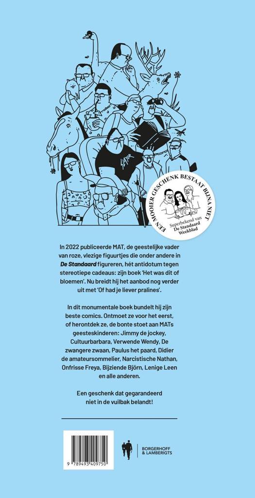 In 2022 publiceerde MAT, de geestelijke vader van roze, vlezige figuurtjes die onder andere in De Standaard figureren, hét antidotum tegen stereotiepe cadeaus: zijn boek Het was dit of bloemen. Dit jaar breidt hij het aanbod nog verder uit met Of had je liever pralines?