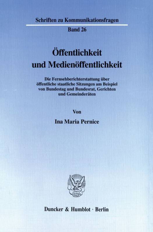 Den Ausgangspunkt der Untersuchung bildet die verfassungsstaatliche Verortung des schillernden Phänomens »Öffentlichkeit«. Dabei werden seine Bezüge zum Demokratieprinzip einerseits und zum Rechtsstaatsprinzip andererseits herausgearbeitet. Im zweiten Schritt verortet Ina Maria Pernice sodann das Recht des Fernsehens auf Berichterstattung verfassungsrechtlich und prüft, inwieweit sich ein Anspruch auf Berichterstattung über staatliches Handeln begründet werden kann. In einem dritten Schritt werden schließlich die einzelnen Vorschriften, durch die die Fernsehberichterstattung über öffentliche staatliche Sitzungen eingeschränkt werden, auf ihre Verfassungsmäßigkeit hin untersucht.