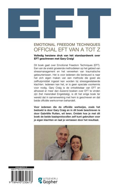 Dit boek gaat over Emotional Freedom Techniques (EFT). Een van de snelst groeiende methodieken op het gebied van stressmanagement en het verwerken van traumatische gebeurtenissen. Het is voor iedereen die benieuwd is naar het zich eigen maken van een methode die goed als zelfhulpmiddel ingezet kan worden bij stressgerelateerde klachten. Iedereen kan het, er is geen speciale voorkennis voor nodig. Gary Craig is de ontwikkelaar van EFT en alhoewel er meer dan duizend boeken over EFT te vinden zijn (het merendeel Engelstalig), is dit het enige boek ter wereld dat in samenwerking met hem