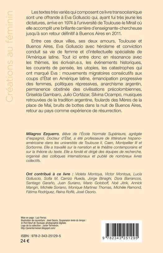 Les textes très variés qui composent ce livre transocéanique sont une offrande à Eva Golluscio qui, ayant fui très jeune les dictatures, arrive en 1974 à l’université de Toulouse-le Mirail où elle accomplit une brillante carrière d’enseignante-chercheuse jusqu’à son retour dénitif à Buenos Aires en 2011. Entre ces deux villes, ses deux amours, Toulouse et Buenos Aires, Eva Golluscio avec héroïsme et conviction conduit sa vie de femme et d’intellectuelle spécialiste de l’Amérique latine. Tout ici entre donc en résonance avec les thèmes, les écrivain.e.s, les événements historiques, les courants de pensée, les utopies, les catastrophes qui ont marqué Eva : mouvements migratoires consécutifs aux coups d’État en Amérique latine, émancipation progressive des femmes, politiques répressives, anarchisme argentin,