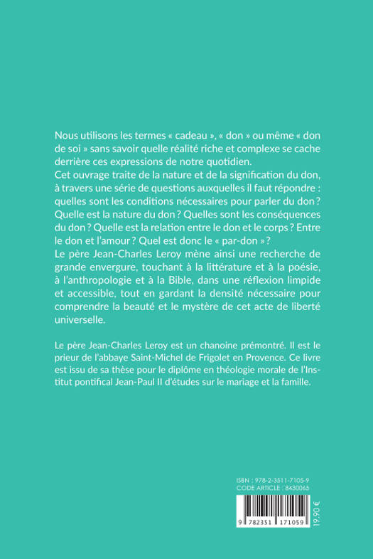 Nous utilisons les termes « cadeau », « don » ou même « don de soi » sans savoir quelle réalité riche et complexe se cache derrière ces expressions de notre quotidien. Ce livre traite de la nature et de la signification du don, à travers une série de questions auxquelles il faut répondre : quelles sont les conditions nécessaires pour parler du don ? Quelle est la nature du don ? Quelles sont les conséquences du don ? Quelle est la relation entre le don et le corps ? Entre le don et l'amour ? Quel est donc le « par-don » ? Le père Jean-Charles Leroy mène une recherche de grande envergure, touchant à la littérature et à la poésie, à l'anthropologie et à la Bible, dans une réflexion limpide et accessible, tout en gardant la densité nécessaire pour comprendre la beauté et le mystère de cet acte de liberté universelle.