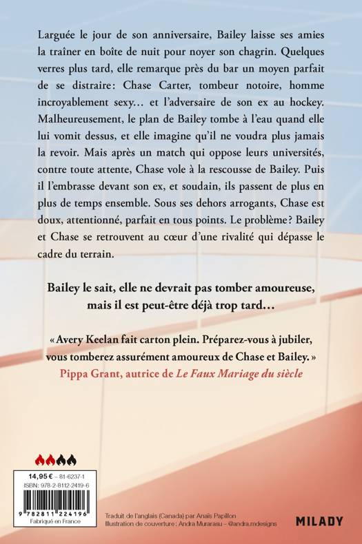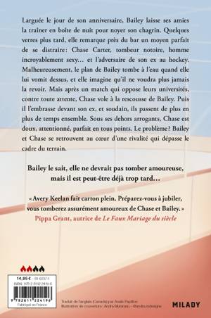 Larguée le jour de son anniversaire, Bailey laisse ses amies la traîner en boîte de nuit pour noyer son chagrin. Quelques verres plus tard, elle remarque près du bar un moyen parfait de se distraire : Chase Carter, tombeur notoire, homme incroyablement sexy... et l'adversaire de son ex au hockey. Malheureusement, le plan de Bailey tombe à l'eau quand elle lui vomit dessus, et elle imagine qu'il ne voudra plus jamais la revoir. Mais après un match qui oppose leurs universités, contre toute attente, Chase vole à la rescousse de Bailey. Puis il l'embrasse devant son ex, et soudain, ils passent de plus en plus de temps ensemble. Sous ses dehors arrogants, Chase est doux, attentionné, parfait en tous points. Le problème ? Bailey et Chase se retrouvent au coeur d'une rivalité qui dépasse le cadre du terrain.