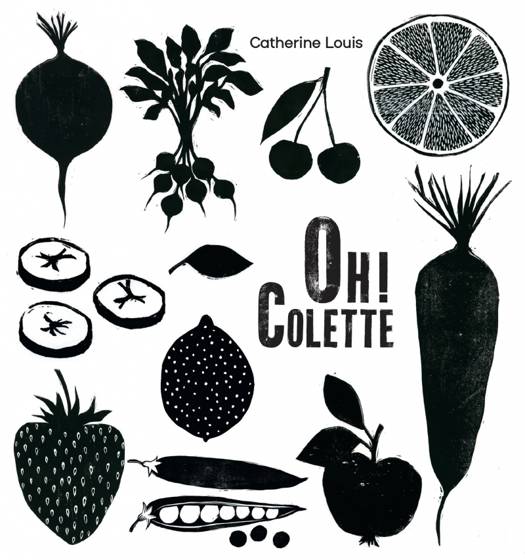 Chaque double page présente les silhouettes noires d'un fruit ou d'un légume, dans deux états différents, entier et découpé, planté et déterré, entre autres.