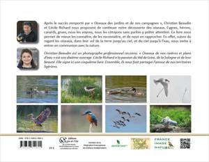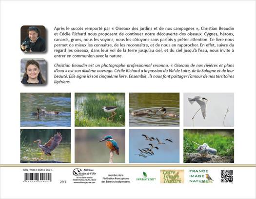 Après le succès remporté par « Oiseaux des jardins et de nos campagnes », Christian Beaudin et Cécile Richard vous proposent de continuer votre découverte des oiseaux. Les « oiseaux de nos rivières et plans d’eau » sont partout présents dans nos paysages naturels. Ils rendent vivants nos contemplations matinales et nos couchers de soleil. Ils touchent le ciel, nous faisant prendre conscience de notre chemin personnel pour nous retrouver en harmonie avec la nature. Pourtant ils restent, pour la plupart d’entre eux, trop méconnus. Cygnes, hérons, canards, grues, nous les voyons, nous les côtoyons sans parfois y prêter attention. Ce livre nous permet de mieux les connaître, de les reconnaître, et de nous en rapprocher. En effet, suivre du regard les oiseaux, dans leur vol de la terre jusqu’au ciel, et du ciel jusqu’à l’eau, nous invite à entrer en communion avec la nature.