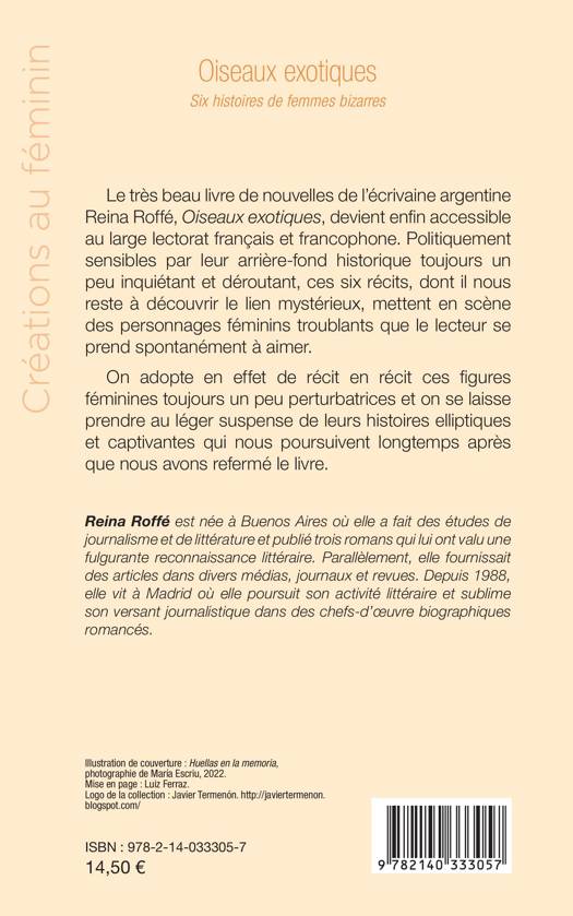 Le très beau livre de nouvelles de l'écrivaine argentine Reina Roffé, Oiseaux exotiques, devient enfin accessible au large lectorat français et francophone. Politiquement sensibles par leur arrière-fond historique toujours un peu inquiétant et déroutant, ces six récits, dont il nous reste à découvrir le lien mystérieux, mettent en scène des personnages féminins troublants que le lecteur se prend spontanément à aimer. On adopte en effet de récit en récit ces figures féminines toujours un peu perturbatrices et on se laisse prendre au léger suspense de leurs histoires elliptiques et captivantes qui nous poursuivent longtemps après que nous avons refermé le livre.