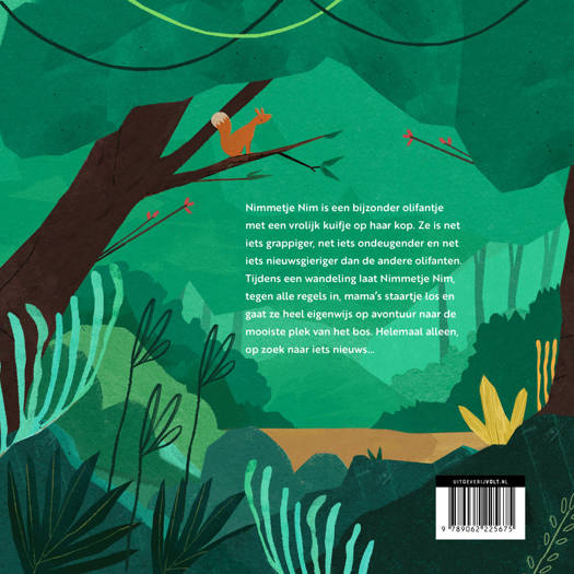 Tijdens een wandeling laat Nimmetje Nim, tegen alle regels in, mama’s staartje los. Ze gaat heel eigenwijs achter een prachtige kolibrie aan en vindt de mooiste plek van het bos. Een prachtig meer met een regenboog van kleuren die ze zelf tevoorschijn tovert met haar slurf. Mama is trots op haar eigenwijze Nimmetje, want die nieuwsgierigheid maakt haar juist zo bijzonder. En haar kuifje natuurlijk!