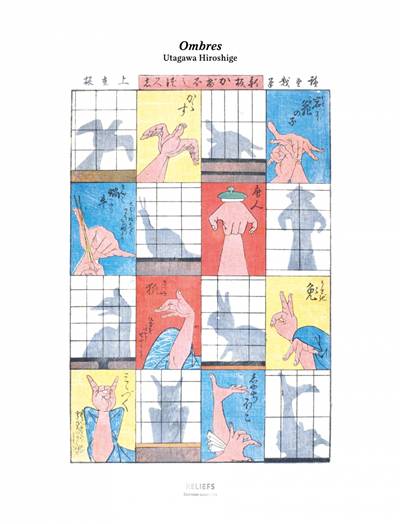 Ces huit ombres avec les mains publiées autour de 1842 par le grand éditeur Jōshūya Jūzō (1812-1876) font partie d’une série de planches d’omocha-e (« estampes de jouets ») destinées aux petits Japonais amateurs du théâtre d’ombres, originaire de la Chine mais aussi de l’Inde. De gauche à droite et de haut en bas, le peintre y montre comment figurer avec ses doigts et quelques accessoires un corbeau, une tortue sur un rocher, un escargot, un homme portant un sugegasa (chapeau conique), un renard, un lapin, un hibou, un Shachihoko (yōkai – monstre – à tête de dragon et corps de carpe), avec quelques instructions manuscrites sur les mouvements à effectuer : « Écarte tes doigts dans ta manche pour figurer les ailes du hibou », « Remue ton genou pour faire onduler le dos du renard », « Fais un va-et-vient avec tes baguettes pour animer les cornes de l’escargot »…