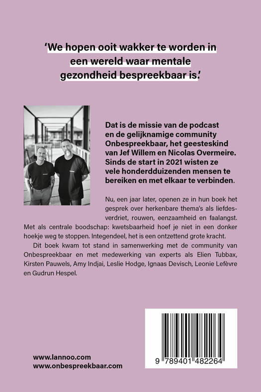 Nu, een jaar later, openen ze in hun boek het gesprek over herkenbare thema's als liefdesverdriet, rouwen, eenzaamheid en faalangst. Met als centrale boodschap: kwetsbaarheid hoef je niet in een donker hoekje weg te stoppen. Integendeel, het is een ontzettend grote kracht. Dit boek kwam tot stand in samenwerking met de community van Onbespreekbaar en met medewerking van experts als Elien Tubbax, Kirsten Pauwels, Amy Indjai, Leslie Hodge, Ignaas Devisch, Leonie Lefèvre en Gudrun Hespel.