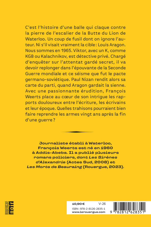 C'est l'histoire d'une balle qui claque contre la pierre de l'escalier de la Butte du Lion de Waterloo. Un coup de fusil dont on ignore l'auteur. Ni s'il visait vraiment la cible : Louis Aragon. Nous sommes en 1965. Viktor, avec un K, comme KGB ou Kalachnikov, est détective privé. Chargé d'enquêter sur l'attentat gardé secret, il va devoir replonger dans l'épouvante de la Seconde Guerre mondiale et ce séisme que fut le pacte germano-soviétique. Paul Nizan rendit alors sa carte du parti, quand Aragon gardait la sienne. Avec une passionnante érudition, François Weerts place au coeur de son intrigue les rapports douloureux entre l'écriture, les écrivains et leur époque. Quelles trahisons pourraient bien faire reprendre les armes vingt ans après la fin d'une guerre ?