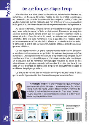 N’en déplaise aux réfractaires, le troisième millénaire est numérique. En très peu de temps, l’usage de ces nouvelles technologies est devenu incontournable. Sans occulter leurs aspects positifs, Christophe Médici s’interroge sur les rapports que l’on entretient avec ces nouveaux outils, parfois au détriment des relations interpersonnelles en réelle présence. Il n’y a qu’à observer l’espace public pour se convaincre qu’une révolution affecte en profondeur nos sociétés : la connexion a pris le pas sur la communication et laisse craindre une dangereuse déliaison. Ce self-help book offre un grand nombre d’outils de libération. Simples et efficaces, ils aideront à organiser un jeûne numérique. Christophe Médici nous invite à repenser nos pratiques pour y insuffler une dose propice d’éthique et d’écologie relationnelle numérique. La lecture de ce livre est un véritable déclic pour toutes celles et ceux qui ne veulent pas sacrifier leur humanité aux promesses du futur.