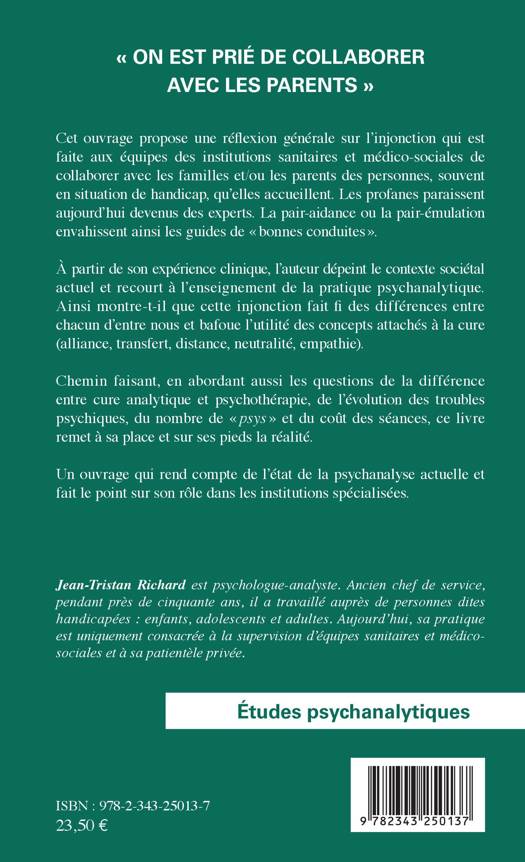 Cet ouvrage propose une réflexion générale sur l'injonction qui est faite aux équipes des institutions sanitaires et médico-sociales de collaborer avec les familles et/ou les parents des personnes, souvent en situation de handicap, qu'elles accueillent. Les profanes paraissent aujourd'hui devenus des experts. La pair-aidance ou la pair-émulation envahissent ainsi les guides de « bonnes conduites ». À partir de son expérience clinique, l'auteur dépeint le contexte sociétal actuel et recourt à l'enseignement de la pratique psychanalytique.