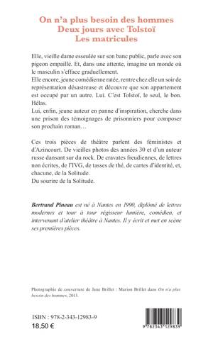 Ces trois pièces de théâtre présentent tour à tour une vieille dame esseulée, imaginant un monde où le masculin s’efface graduellement, une comédienne ratée qui découvre son appartement occupé par Tolstoï et enfin, un jeune auteur cherchant l’inspiration pour son futur roman dans le témoignage de prisonniers.