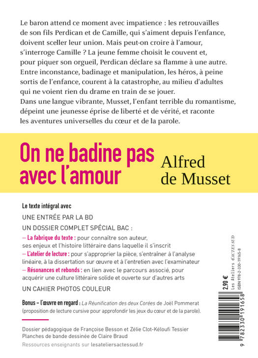 Le baron attend ce moment avec impatience : les retrouvailles de son fils Perdican et de Camille, qui s'aiment depuis l'enfance, doivent sceller leur union. Mais peut-on croire à l'amour, s'interroge Camille ? La jeune femme choisit le couvent et, pour piquer son orgueil, Perdican déclare sa flamme à une autre. Entre inconstance, badinage et manipulation, les héros, à peine sortis de l'enfance, courent à la catastrophe, au milieu d'adultes qui ne voient rien du drame en train de se jouer. Dans une langue vibrante, Musset, l'enfant terrible du romantisme, dépeint une jeunesse éprise de liberté et de vérité, et raconte les aventures universelles du coeur et de la parole. L'édition comprend le texte intégral de l'oeuvre, avec : UNE ENTRÉE PAR LA BD UN DOSSIER COMPLET SPÉCIAL BAC : - La fabrique du texte : présentation de l'auteur, de l'oeuvre et de l'histoire littéraire dans laquelle elle s'inscrit - L'atelier de lecture : études d'ensemble, explications de texte guidées, activités d'appropriation, entraînement aux épreuves écrites et à l'entretien oral du bac - Résonances et rebonds : groupement de textes en lien avec le parcours associé et histoire des arts UN CAHIER PHOTOS COULEUR