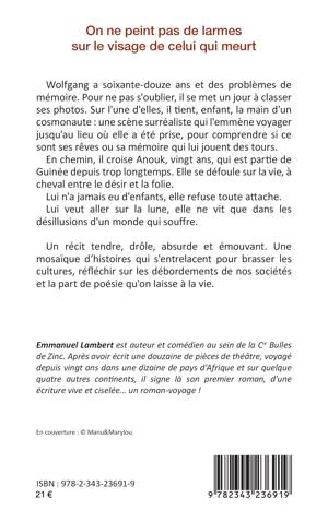 Wolfgang a soixante-douze ans et des problèmes de mémoire. Pour ne pas s'oublier, il se met un jour à classer ses photos. Sur l'une d'elles, il tient, enfant, la main d'un cosmonaute: une scène surréaliste qui l'emmène voyager jusqu'au lieu où elle a été prise, pour comprendre si ce sont ses rêves ou sa mémoire qui lui jouent des tours. En chemin, il croise Anouk, vingt ans, qui est partie de Guinée depuis trop longtemps. Elle se défoule sur la vie, à cheval entre le désir et la folie. Lui n'a jamais eu d'enfants, elle refuse toute attache. Lui veut aller sur la lune, elle ne vit que dans les désillusions d'un monde qui souffre. Un récit tendre, drôle, absurde et émouvant. Une mosaïque d'histoires qui s'entrelacent pour brasser les cultures, réfléchir sur les débordements de nos sociétés et la part de poésie qu'on laisse à la vie.