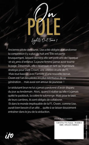 Ancienne pilote de course, Lise a été obligée d’abandonner la compétition il y a plus de huit ans. Elle est partie brusquement, laissant derrière elle son petit-ami de l’époque et ses amis d’enfance. La jeune femme pense avoir tourné la page. Désormais, elle s’épanouie en tant qu’ingénieure stratégie pour Dark Crown, une célèbre écurie de F1. Mais tout bascule avec l’arrivée d’une nouvelle recrue. Owen est l’un des pilotes les plus talentueux de sa génération… mais aussi son amour de jeunesse ! Le séduisant brun ne lui a jamais pardonné d’avoir disparu du jour au lendemain. Alors, quand il réalise qu’elle n’a jamais quitté le paddock, la colère le submerge. Mais pour le bien de leurs carrières, ils sont obligés de collaborer. Et dans le monde impitoyable de la F1, Owen, comme Lise, aurait bien besoin d’un allié… quitte à se laisser doucement entraîner dans le jeu de la séduction.