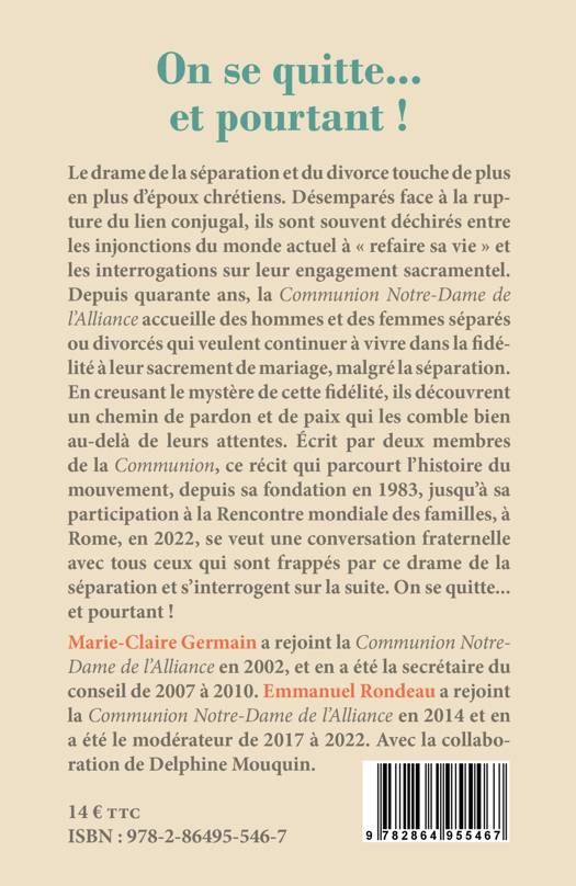 Le drame de la séparation et du divorce touche de plus en plus d'époux chrétiens. Désemparés face à la rupture du lien conjugal, ils sont souvent déchirés entre les injonctions du monde actuel à «refaire sa vie» et les interrogations sur leur engagement sacramentel. Depuis quarante ans, la Communion Notre Dame de l'Alliance accueille des hommes et des femmes séparés ou divorcés qui veulent continuer à vivre dans la fidélité à leur sacrement de mariage, malgré la séparation. En creusant le mystère de cette fidélité, ils découvrent un chemin de pardon et de paix qui les comble bien au-delà de leurs attentes. Écrit par deux membres de la Communion, ce récit qui parcourt l'histoire du mouvement, depuis sa fondation à Rennes, en 1983, jusqu'à sa participation à la Rencontre mondiale des familles, à Rome, en 2022, se veut une conversation fraternelle avec tous ceux qui sont frappés par ce drame de la séparation et s'interrogent sur la suite. On se quitte... et pourtant !
