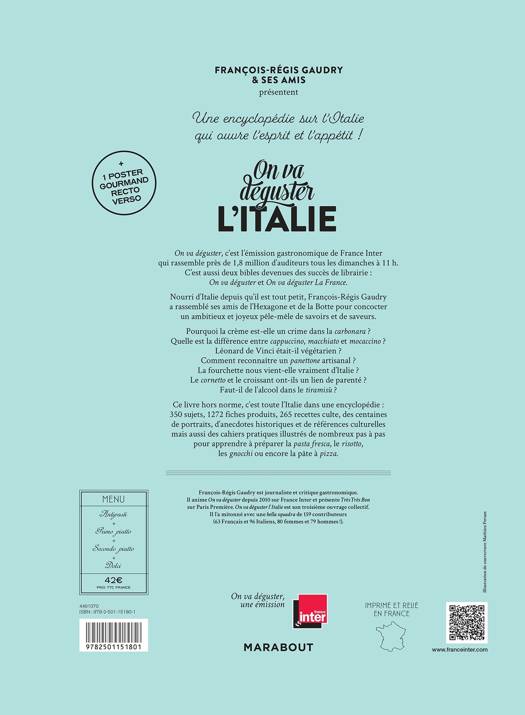 En abordant près de 350 sujets, 100 recettes iconiques, tous les produits emblématiques de la gastronomie italienne, des portraits de personnages illustres, des centaines de cartes, tableaux, adresses, tours de main, anecdotes croustillantes... Gaudry & ses amis proposent une encyclopédie désordonnée dans laquelle se plonger ou simplement picorer pour savourer l’Italie du Nord au Sud ! Dans un inventaire décalé, plein d’humour, foisonnant d’illustrations, ce sont tous les savoirs et les saveurs du formidable patrimoine gastronomique de nos voisins italiens qu’ils nous invitent à découvrir.