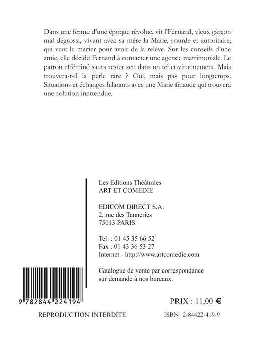 Dans une ferme d'une époque révolue, vit l'Fernand, vieux garçon mal dégrossi, vivant avec sa mère la Marie, sourde et autoritaire, qui veut le marier pour avoir de la relève. Sur les conseils d'une amie, elle décide Fernand à contacter une agence matrimoniale. Le patron efféminé saura rester zen dans un tel environnement. Mais trouvera-t-il la perle rare ? Oui, mais pas pour longtemps. Situations et échanges hilarants avec une Marie finaude qui trouvera une solution inattendue.