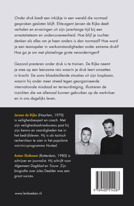 Gezond presteren onder druk is te trainen. Aan de hand van acht competenties – assertiviteit, communicatie, samenwerken, omgevingsbewustzijn, besluitvorming, leiderschap, creativiteit en stressbehendigheid – leert voormalig eliteagent Jeroen de Rijke je druk om te zetten in kracht. De soms bloedstollende situaties uit zijn loopbaan, waarin hij onder meer streed tegen georganiseerde internationale misdaad en terreurdreiging, illustreren de inzichten die we allemaal kunnen gebruiken op de werkvloer en in ons dagelijks leven.