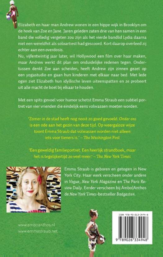 Zoe, Elizabeth en Andrew zijn al sinds de universiteit beste vrienden en hebben samen in een band gezeten. Inmiddels zijn ze getrouwd, hebben een huis in Brooklyn, een baan en tienerkinderen, maar proberen krampachtig hun jeugd te behouden. Niets drukt ze echter zo met de neus op de feiten dan het moment dat ze het stokje (qua drugs, seksualiteit en onafhankelijkheid) moeten overdragen aan hun kroost. De zomer dat hun kinderen achttien worden (en het bed met elkaar delen), begint hun zo goed georganiseerde leven in duigen te vallen, waarbij oude geheimen boven water komen; over henzelf, maar ook over hun aan een overdosis overleden vierde bandlid. Hun vriendschap wordt zwaar op de proef gesteld. Met 'Onder ons' heeft Emma Straub, schrijfster van de succesvolle roman 'Badgasten', een vlijmscherpe maar hartverwarmende roman geschreven over vriendschap, ambitie en liefde. 'Slim, cool en droog. Net als van "Badgasten", zul je van deze roman smullen.' – 'Elle' 'Een van de romans waar ik het meest naar uitkijk dit jaar.' – 'The Washington Post'