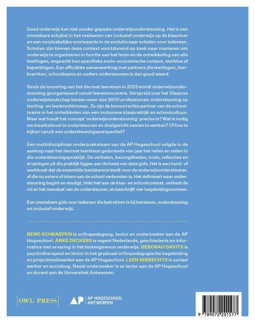 Een multidisciplinair onderzoeksteam van de AP Hogeschool volgde in de aanloop naar het decreet leersteun gedurende vier jaar het reilen en zeilen in die ondersteuningspraktijk. De verhalen, bezorgdheden, tools, reflecties en ervaringen uit die praktijk liggen aan de basis van deze gids. Het is een hand- of werkboek dat de essentiële basiskennis biedt voor de onderwijsondersteuner, of die nu extern of intern aan de school verbonden is. Het definieert waar ondersteuning begint en eindigt, linkt het aan de klas- en schoolcontext, verkent de rol en het mandaat van de ondersteuner, en beschrijft vier begeleidingsvormen.