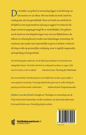 De werelden van geloof en wetenschap liggen in de beleving van veel mensen ver uit elkaar. Wie met beide iets heeft, heeft het vandaag dan ook niet gemakkelijk. Want wat heeft een oud boek als de Bijbel in onze hypermoderne tijd nog te zeggen? In Onderzoek alle dingen wordt een poging gewaagd dit te verduidelijken. Dat gebeurt aan de hand van tien diepteboringen naar concrete Bijbelteksten, die telkens in verband gebracht worden met hedendaagse wetenschap. De resultaten zijn zonder meer opmerkelijk en geven te denken. Onderzoek alle dingen mikt op persoonlijke verdieping, maar is tegelijk toegesneden op bespreking in kringverband.