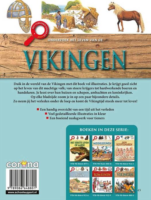 Duik in de wereld van de Vikingen met dit boek vol illustraties. Je krijgt goed zicht op het leven van dit machtige volk; van stoere krijgers tot hardwerkende boeren en handelaren. Je leest over hun huizen en schepen, ambachten en koninkrijken. Op elke bladzijde zoom je in op een paar bijzondere details. Zo neem jij het verleden onder de loep en komt de Vikingtijd steeds meer tot leven!