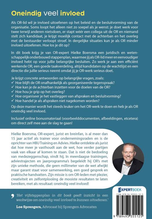 In dit boek krijg je van OR-expert Hielke Boersma een juridisch en weten- schappelijk onderbouwd stappenplan, waarmee jij als OR-lid meer en eenvoudiger invloed hebt op voor jullie belangrijke besluiten. Zo werk je aan een efficiënt werkende OR, een goede taakverdeling, altijd kandidaten op de wachtlijst en een directie die jullie serieus neemt omdat jij je OR-werk serieus doet.